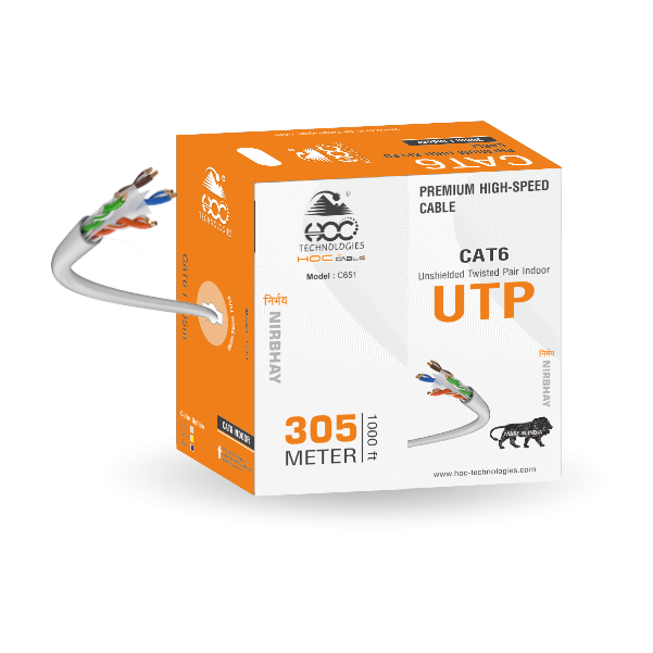 The HOC NIRBHAY CAT6 Pure Copper Indoor Cable is designed for superior data performance and long-term reliability in structured indoor networking environments. Built with 24 AWG solid EC-grade copper conductors, it ensures high conductivity, minimal signal loss, and consistent data transmission across extended distances.