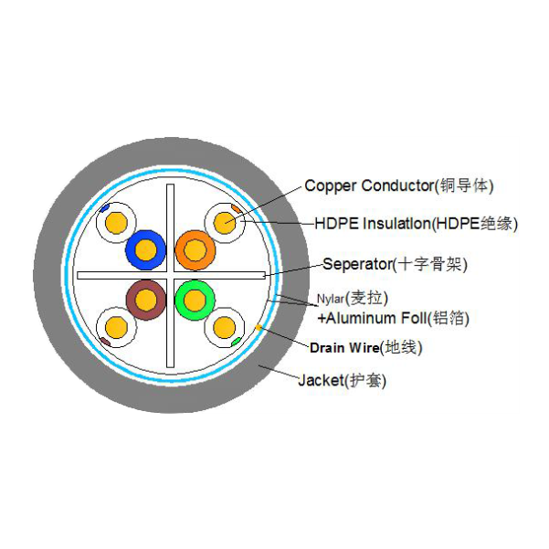 The cable features HDPE insulation, LSZH outer jacket, and a rugged 7.6mm diameter, ensuring safe installation in harsh environmental conditions. With compliance to ANSI/EIA-568C.2 and ISO/IEC 11801 standards, it supports applications such as Gigabit Ethernet, 1000 Base-T/Tx, ATM networks, and even 10Gb Ethernet under suitable conditions.