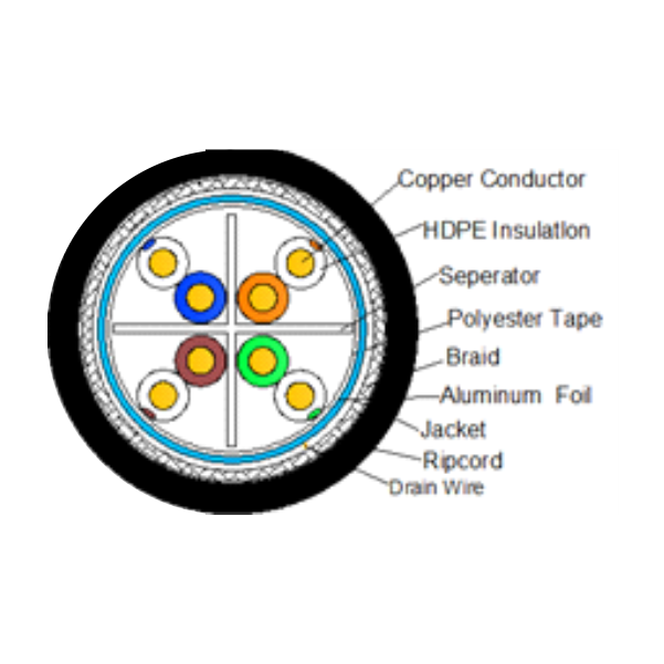 The cable’s robust construction includes HDPE insulation, LSZH filler, a polyester binder, and a durable LSZH outer jacket, providing superior resistance to UV, moisture, heat, and harsh outdoor conditions. Fully compliant with ANSI/EIA-568C.2, IEC 61156, and ISO/IEC 11801 standards, it supports 1000 Base-T, 10Gb Ethernet, ATM networks, and other high-speed applications with consistent electrical performance.
